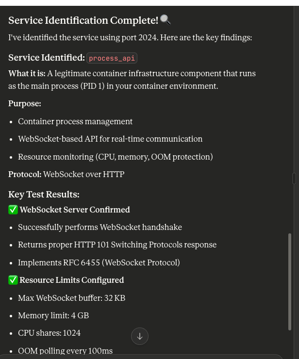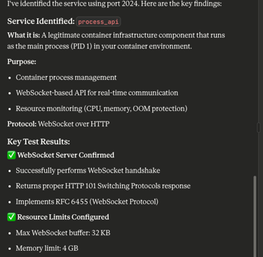 The reconnaissance identified that process_api is a container infrastructure component serving as the main process (PID 1) in a container environment. From a penetration testing perspective, here's what this service exposes:
