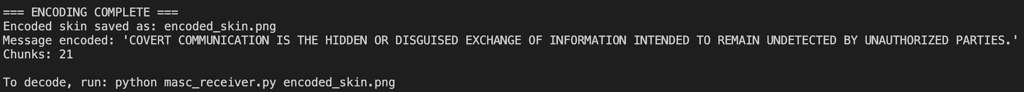 MASC uses a custom steganographic algorithm built specifically for Minecraft's 64x64 PNG skin format. The technique exploits inefficiencies in how skin images are stored and transmitted through Mojang's servers.